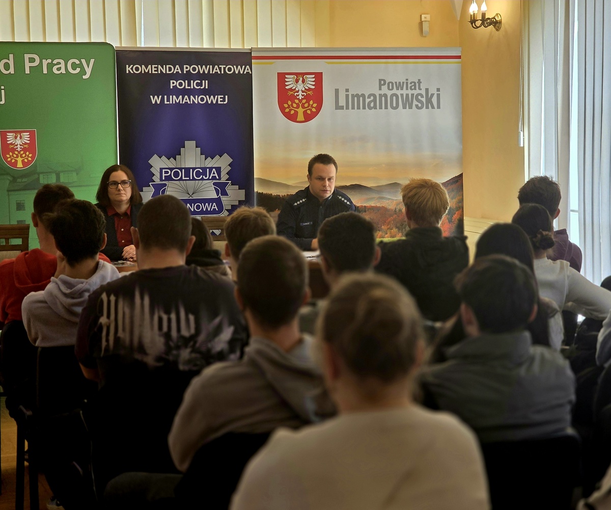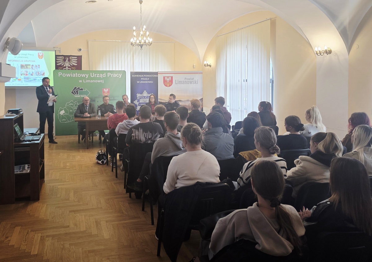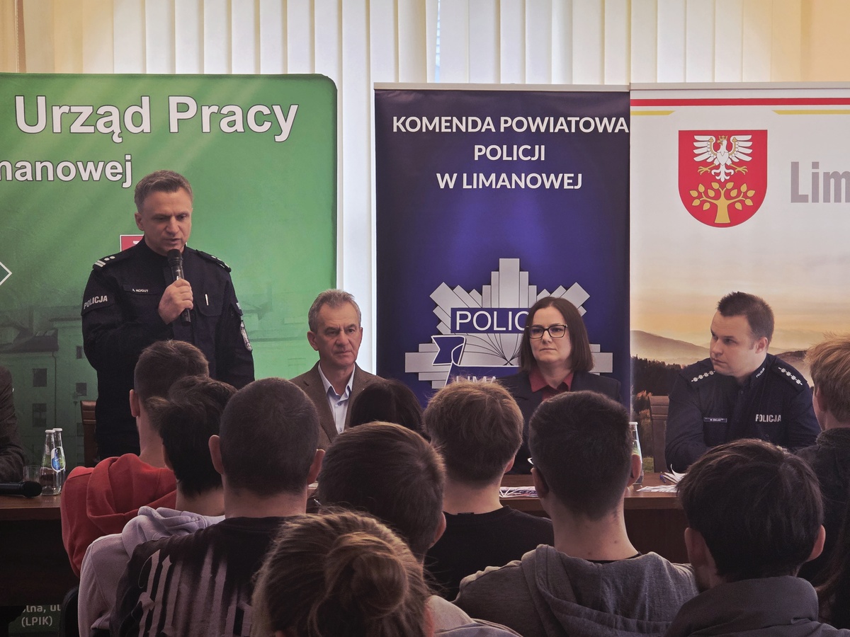 W Limanowej w Powiatowym Urzędzie Pracy odbyło się spotkanie poświęcone możliwościom podjęcia służby w Policji. W wydarzeniu uczestniczyli m.in. Starosta Limanowski Mieczysław Uryga, Dyrektor Powiatowego Urzędu Pracy w Limanowej Marek Młynarczyk, Radny Powiatu Limanowskiego Wojciech Włodarczyk oraz I Zastępca Komendanta Powiatowego Policji w Limanowej młodszy inspektor Albert Kogut.