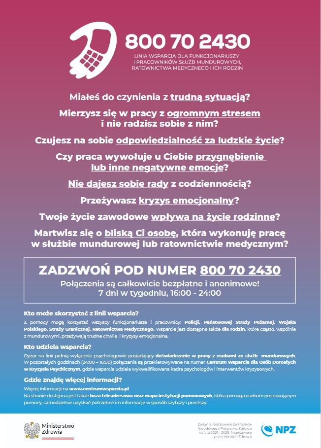 Linia Wsparcia Powrót Drukuj Linia Wsparcia dla Funkcjonariuszy i Pracowników Służb Mundurowych, Ratownictwa Medycznego i ich Rodzin. Pliki do pobrania 522.91 KB