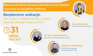 - Webinar na temat bezpiecznych wakacji Zapraszamy do udziału w webinarze organizowanym w dniu 31 lipca w godz. 18:30 – 20:00 przez Rzeczniczkę Praw Dziecka Monikę Horna-Cieślak na temat bezpiecznych wakacji, podczas którego omówimy kluczowe aspekty związane z bezpieczeństwem dzieci i nastolatków.